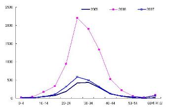 지 난 2000년 A형간염을 지정법정전**으로 등재한 이후, 특히 ‘08년부터 신고 건수가 증가하였으며, 지역별로는 수도권 지역(인천, 경기, 서울)에서 신고건수가 높고 이들 지역에서 시기적으로도 먼저 발생하는 것으로 나타났다. 연령대별로는 주로 20~30대가 전체 신고 건수의 79%를 차지하고 있어 주의가 필요하다.(그림 참조).