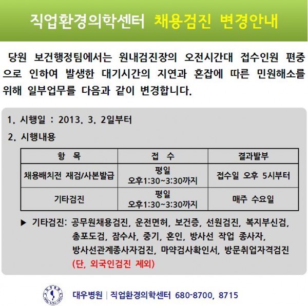 [안내] 직업환경의학센터 채용검진 변경안내 페이지 정보 대우병원 작성일13-03-12 23:23 조회98,455회 댓글0건 본문 [안내] 직업환경의학센터 채용검진 변경안내 이전글 다음글 목록