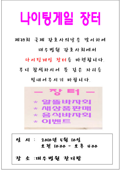 5월 10일(월) 나이팅게일 장터 개최 페이지 정보 대우병원 작성일10-04-29 17:04 조회100,609회 댓글0건 본문 5월 10일(월) 나이팅게일 장터 개최 이전글 다음글 목록