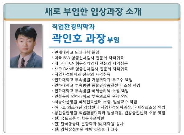 [부임] 직업환경의학과 곽인호 과장 부임 페이지 정보 대우병원 작성일15-06-23 09:48 조회91,379회 댓글0건 본문 [부임] 직업환경의학과 곽인호 과장 부임 이전글 다음글 목록
